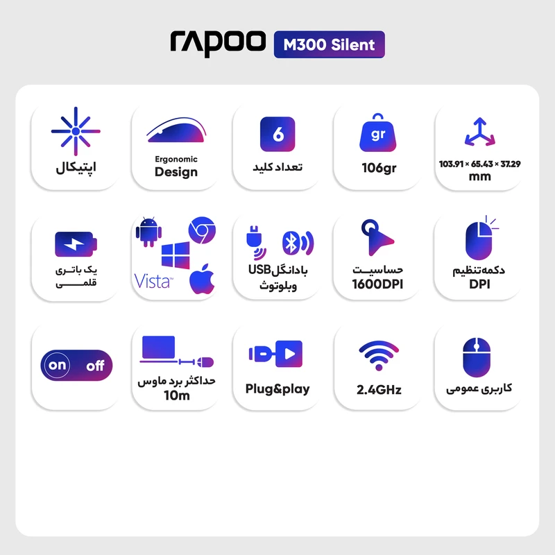 ماوس بی سیم رپو مدل M300 Silent با داشتن امکان اتصال بی سیم به وسیله دانگل USB و بلوتوث نسخه 3.0 و 4.0 از سازگاری بسیار گسترده ای با انواع دیوایس ها برخوردار است. این موس از نظر دوام شرایط بسیار مطلوبی داشته و مقاومت بالایی دارد. منبع تغذیه این موس در حالت بی سیم یک باتری نیم قلمی از نوع AAA است که می تواند تا مدت زمان تقریبی 9 ماه کارایی داشته باشد. داشتن DPI قابل تنظیم تا 1600 DPI از جمله قابلیت های مهم این موس می باشد.