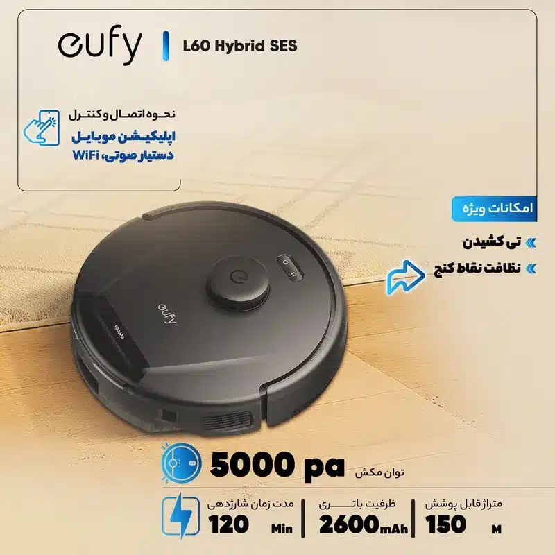 جارو رباتیک هوشمند یوفی مدل Eufy L60 Hybrid T2268 یک انتخاب بینظیر برای افرادی است که به دنبال دستگاهی کارا و با بهرهوری بالا برای نظافت منازل خود هستند. این محصول با قدرت مکش فوقالعاده 5,000 پاسکال، قادر به جمعآوری مو، خردهریز و گرد و غبار در یک بار عبور است و کفهای خانه شما را به طرز باورنکردنی تمیز میکند. اگر در خانه پارکت، فرش یا سطوح مختلفی دارید، Eufy L60 Hybrid به سادگی با تغییر سطح قدرت مکش، نظافت را به بهترین شکل انجام میدهد.